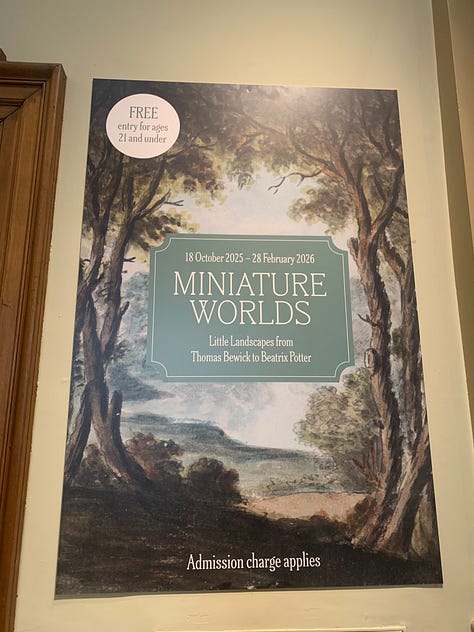 Miniature Worlds (I was sold just by the name) is a fabulous display of original tiny art by such titans as Thomas Bewick, Turner, Ravillious, Kate Greenaway, and BEATRIX POTTER. It was obviously meant to be.