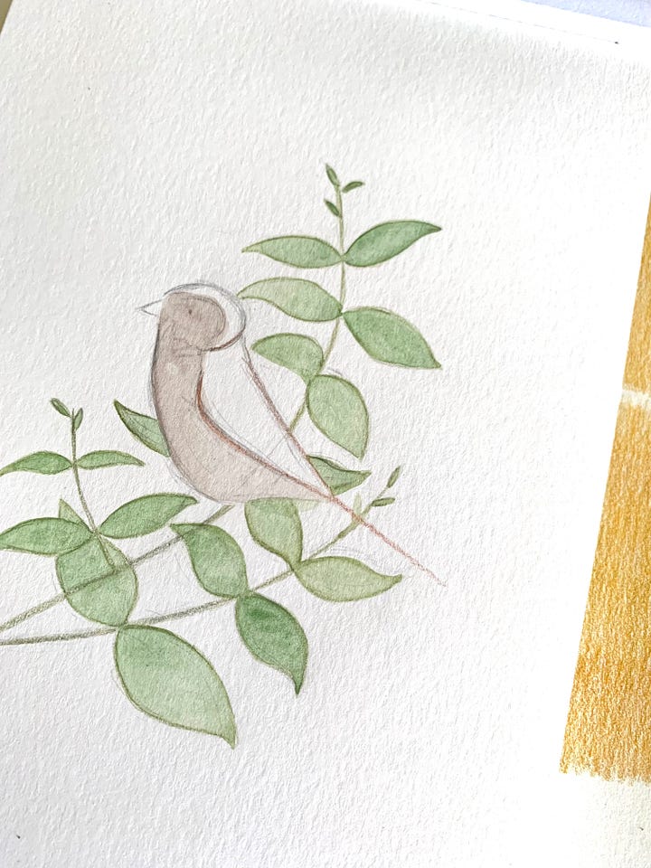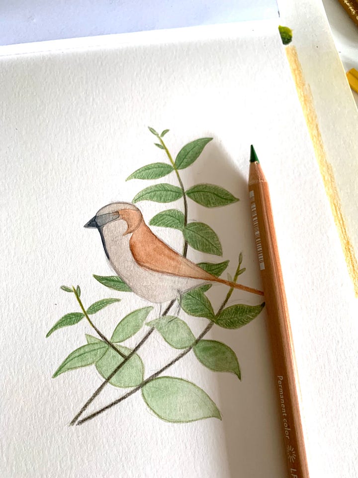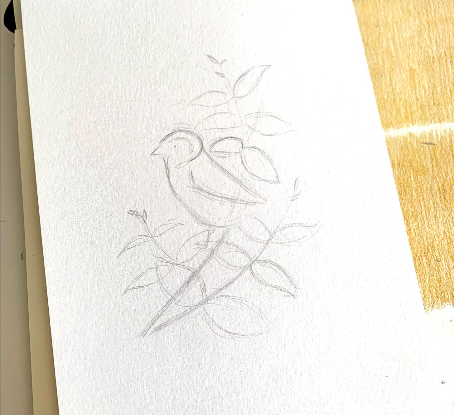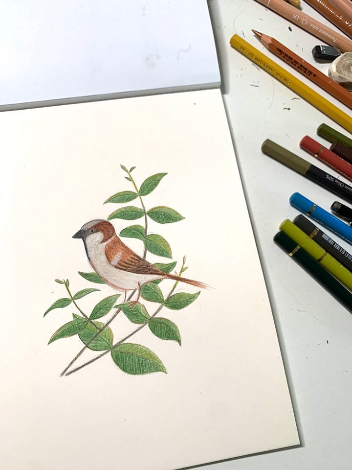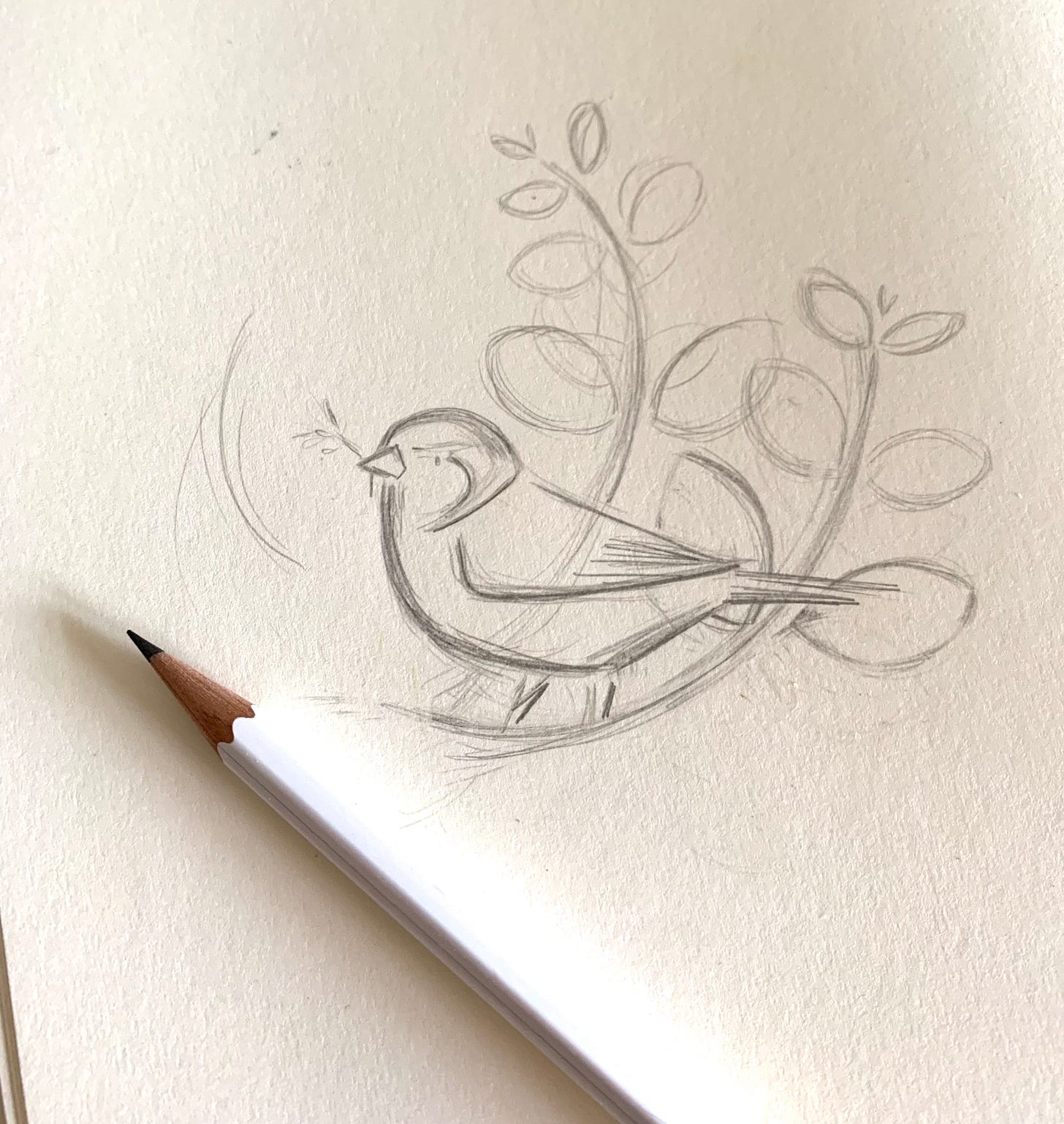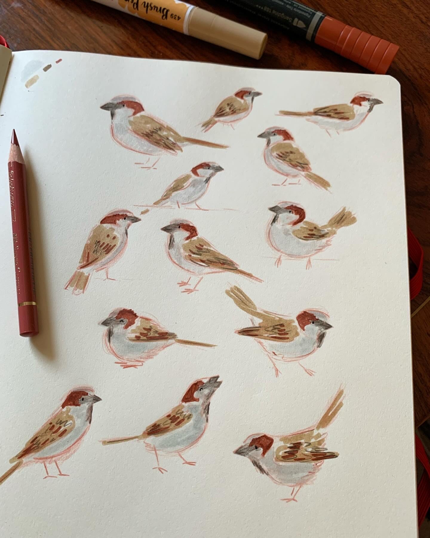 When I’m starting on a new piece, I’ll always begin with lots of quick, lose sketches to get to know my subject. In this case, since I’m pretty familiar with birds (lol) it wasn’t hard to spend a bit of time drawing a page of sparrows to remind myself of their form, character and markings. Unless I have any personal photos, I use reference images for this from google and pinterest.